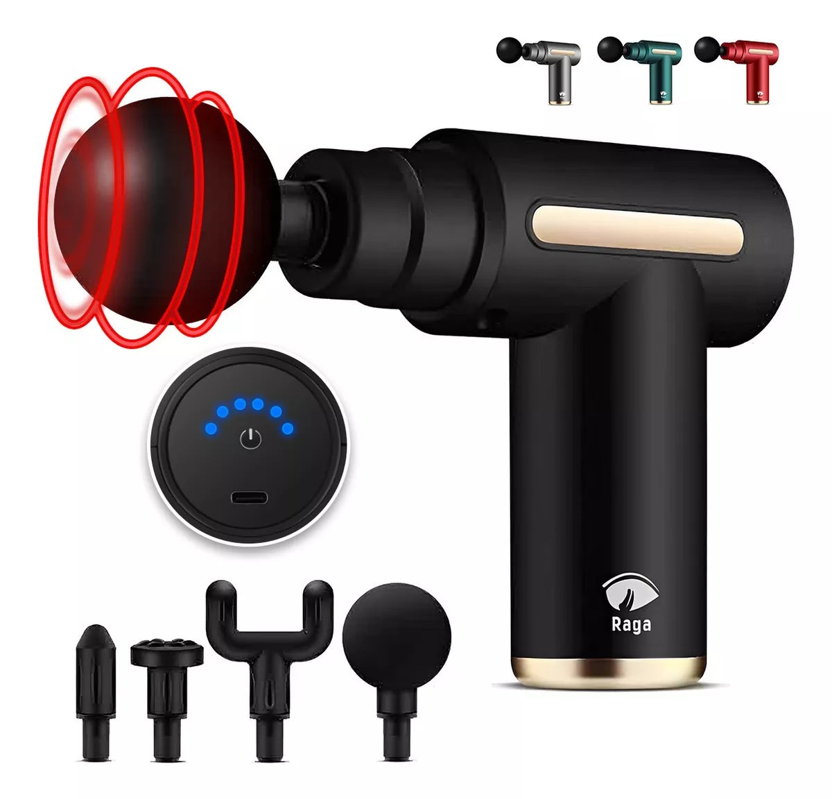La Pistola de Masaje Alivio MAX cuenta con 4 cabezales para atender diferentes partes del cuerpo